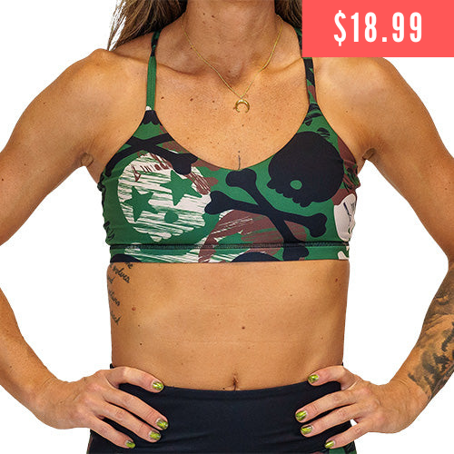 back view of criss cross strap design on green, black, brown and tan camo skull patterned bra