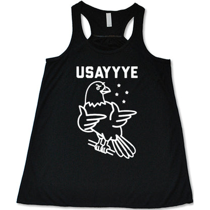 black tank with saying "usayyye" and an eagle in white