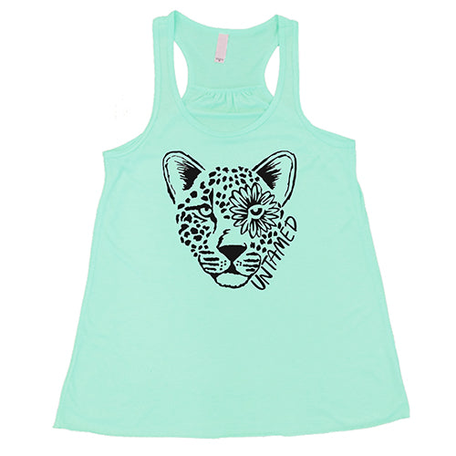 leopard and the words "untamed" on a teal racerback tank