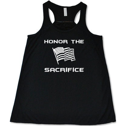 black tank with the saying "honor the sacrifice" and an American flag in white