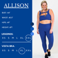 Model's measurements of 38 inch bust, 34 inch waist, 43.5 inch hips, and height of 5 foot 9 inches. She is wearing a size medium in our leggings