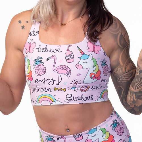 pink unicorn themed sports bra