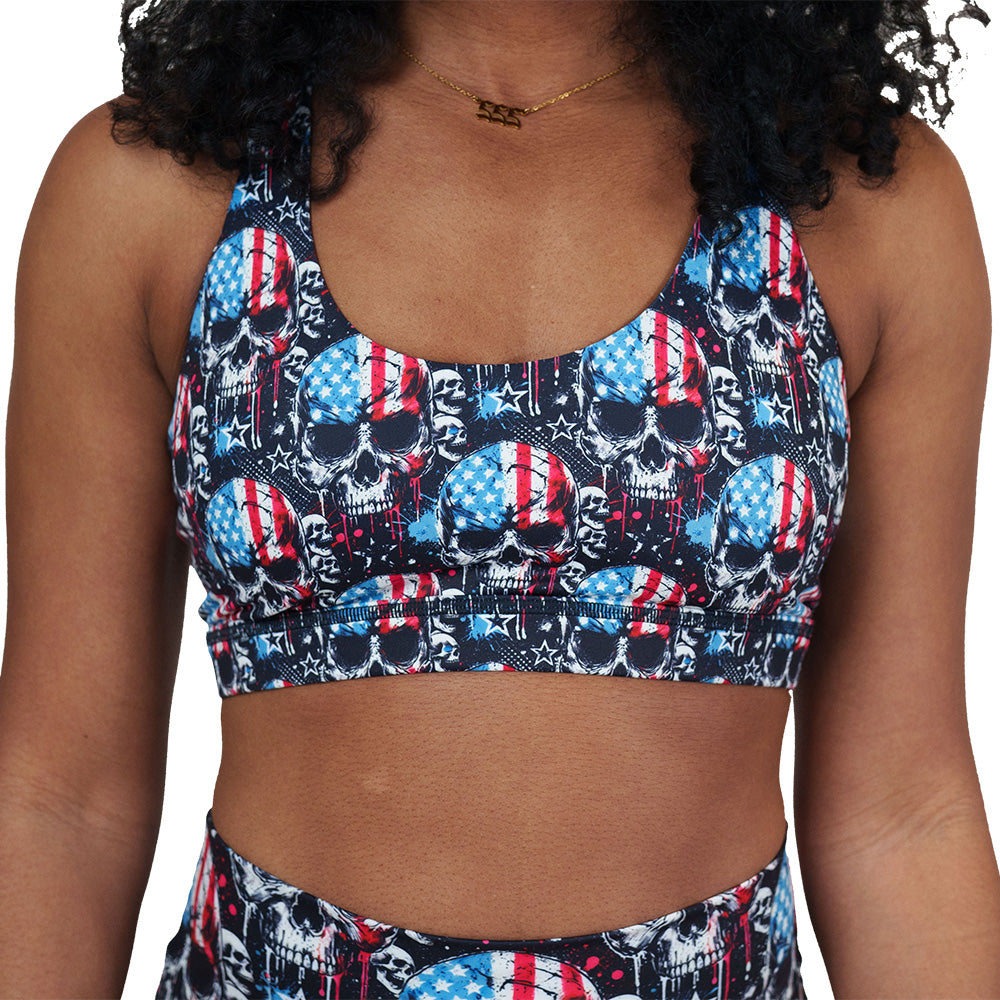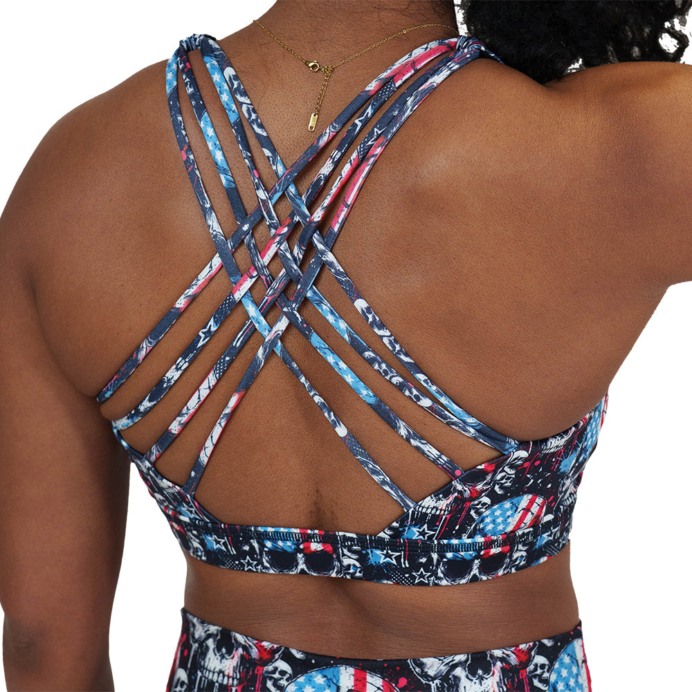 This strappy workout bra is designed to match our United Skulls Leggings perfectly. This butterfly back design is medium impact and will have you looking your best during your workout!