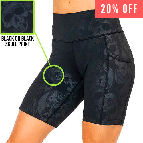 Shop our Shadow Skulls workout shorts for women. High-quality, fun gym shorts for all types of fitness that stay in place no matter what you're doing.