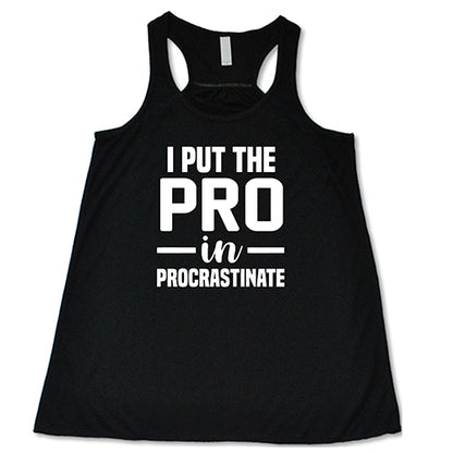 Shop our I Put The Pro In Procrastinate shirt.  Affordable, funny shirt for all types of fitness.