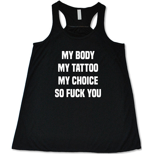 Shop our My Body My Tattoo My Choice So Fuck You shirt.  Affordable, high quality workout shirt for all types of fitness.  Great for anyone who is done with being judged for their tattoos. Wear them proud!