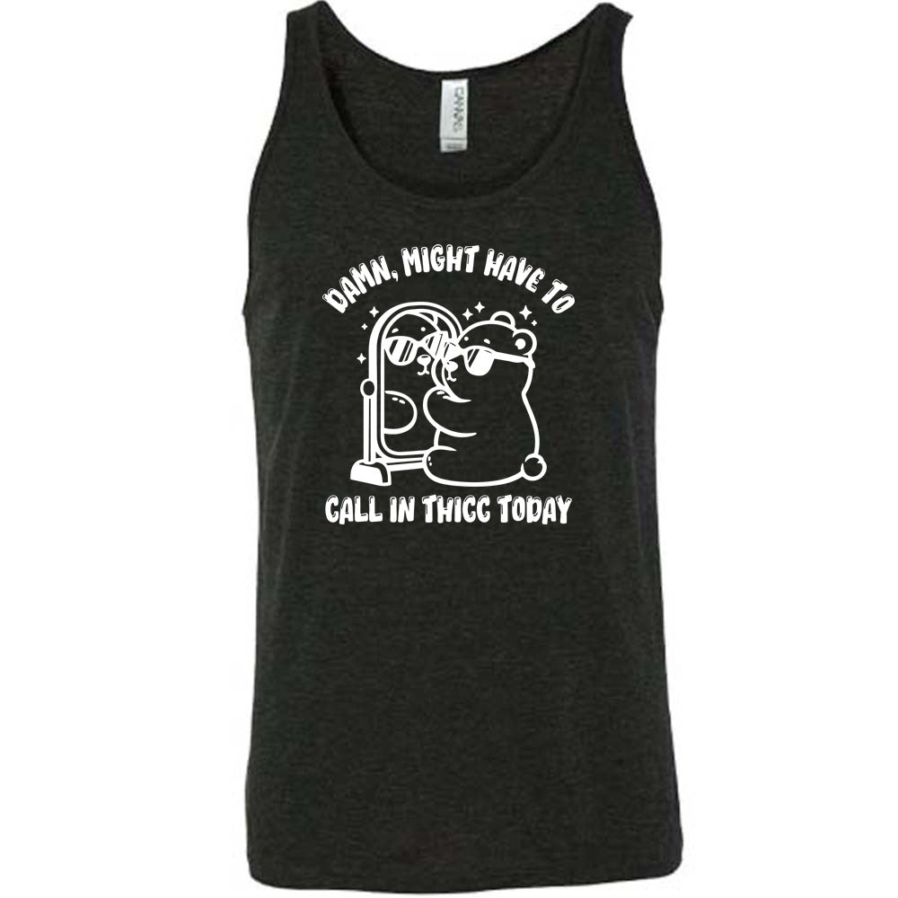 black shirt with the text "Damn Might Have To Call In Thicc Today" on it