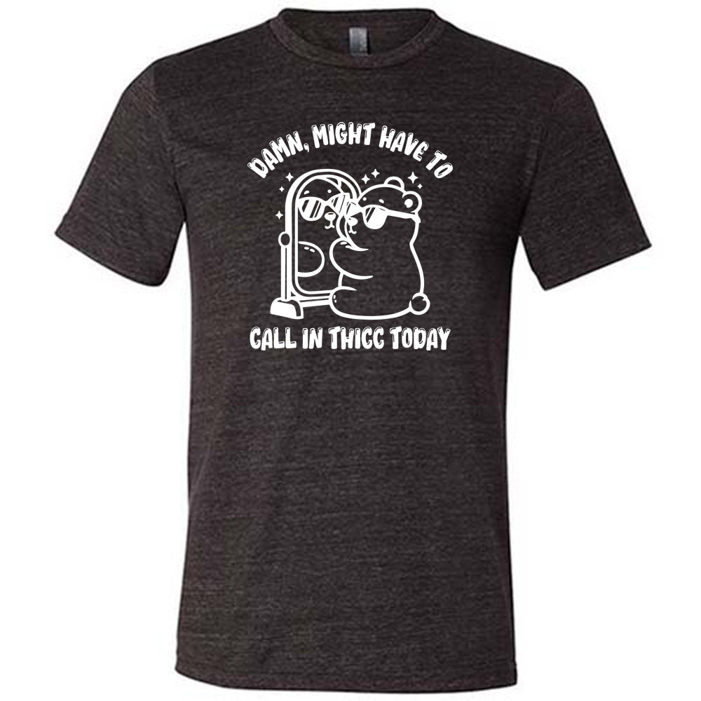 grey shirt with the text "Damn Might Have To Call In Thicc Today" on it