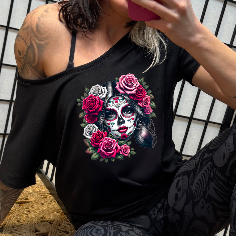This new Day Of The Dead Slouchy Tee redefines casual comfort! Its off-the-shoulder design and super-soft fabric make it the ultimate relaxed fit. Lookin' good never felt so good!