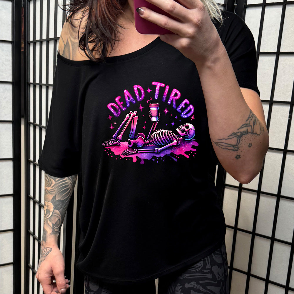 This new Dead Tired Slouchy Tee redefines casual comfort! Its off-the-shoulder design and super-soft fabric make it the ultimate relaxed fit. Lookin' good never felt so good!