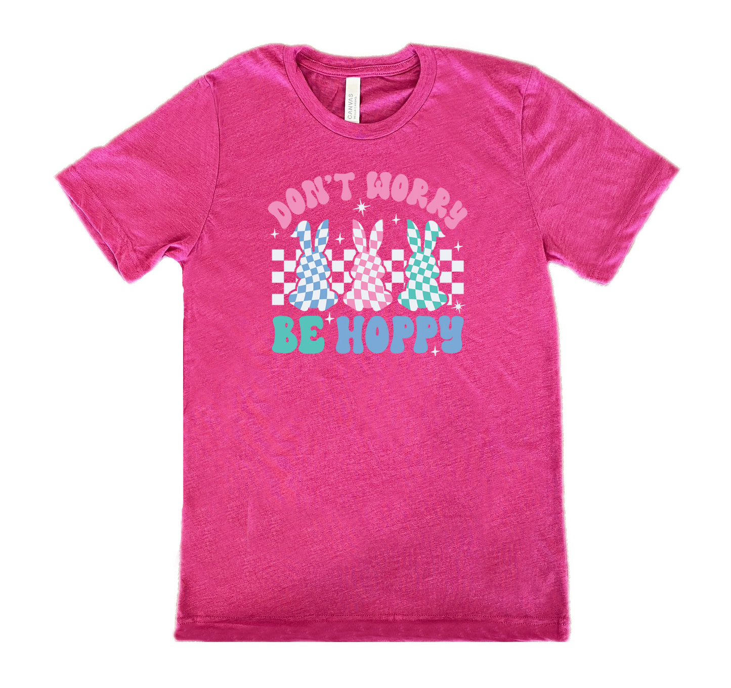 Berry colored shirt with a checkered bunny graphic on it that says "Don't Worry Be Hoppy"