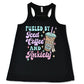 black racerback shirt with the quote "Fueled By Iced Coffee And Anxiety" on it in blue, pink and purple