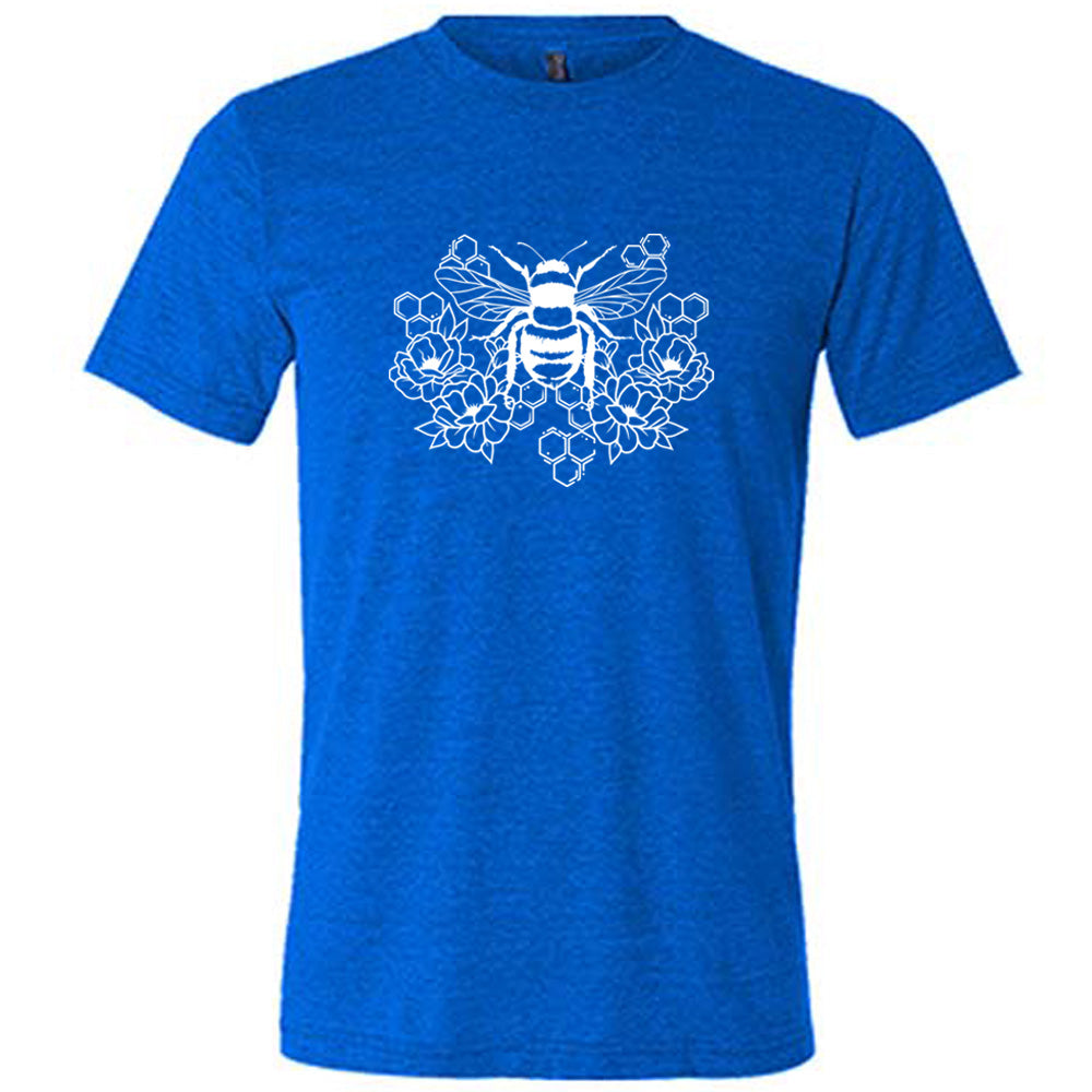 Blue colored shirt with a bee, honeycomb, and flower graphic on it
