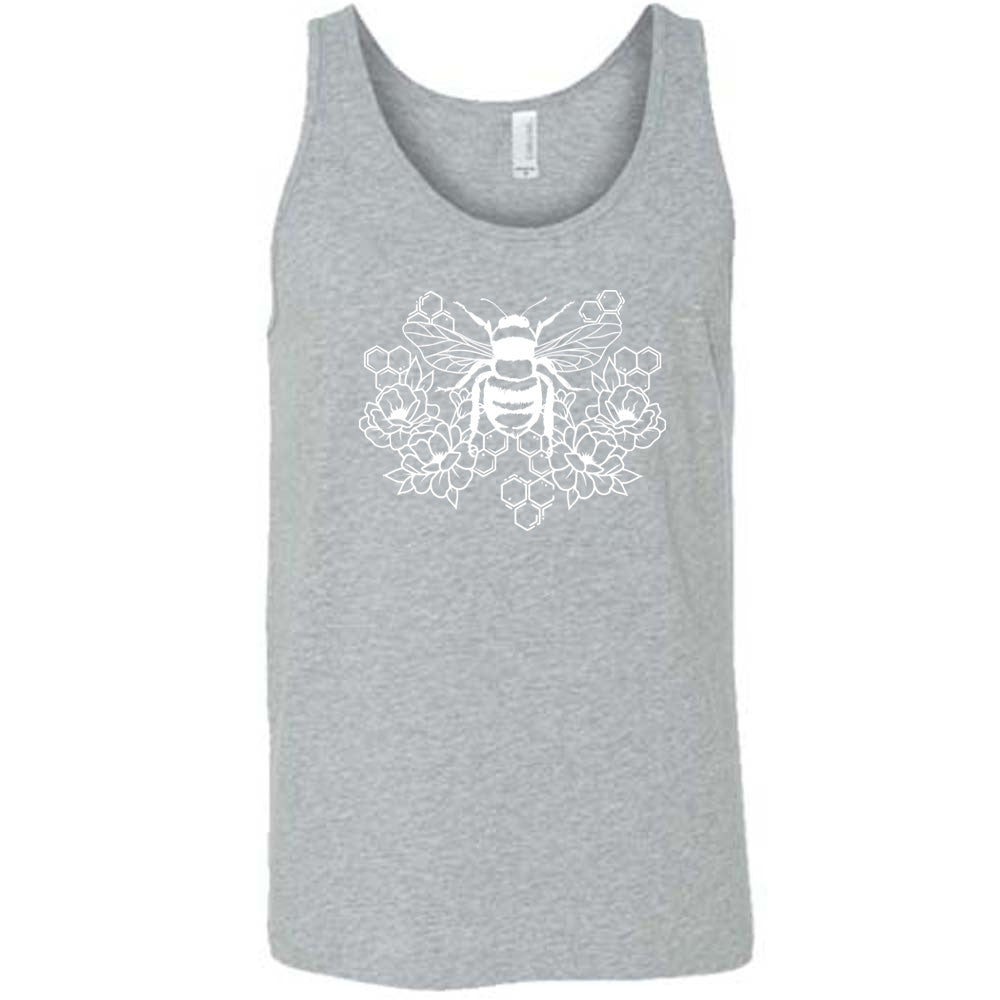 Grey colored tank with a bee, honeycomb, and flower graphic on it