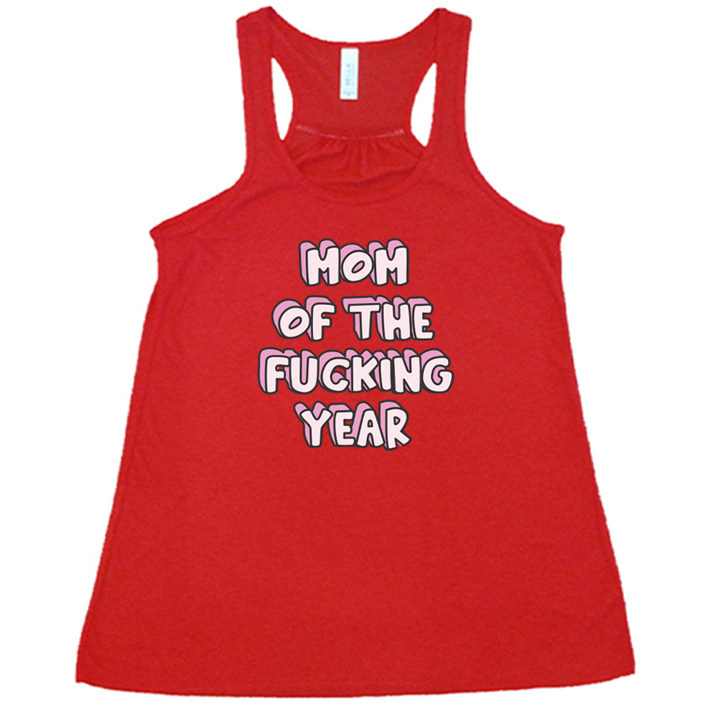 Red colored flowy tank with a graphic on it that says "Mom of the Fucking Year"