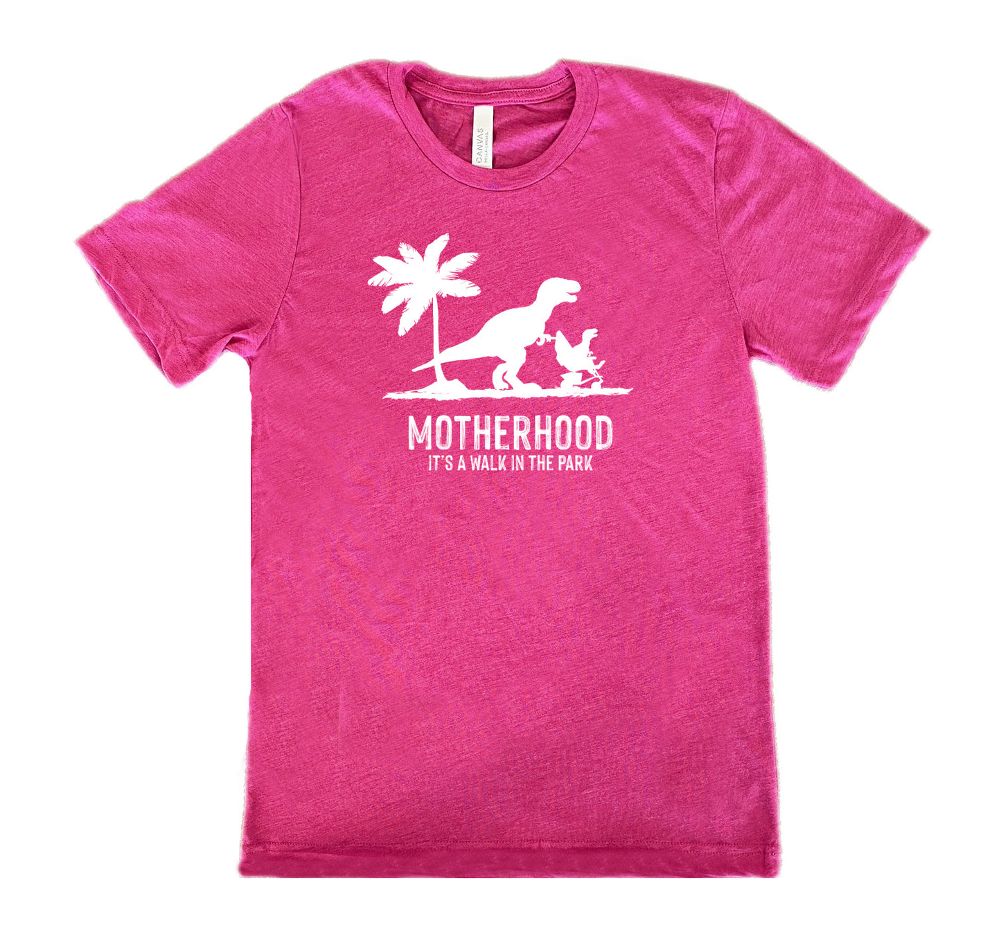 Berry colored shirt with a mother and child dinosaur graphic on it that says "Motherhood, Its a Walk in the Park"