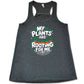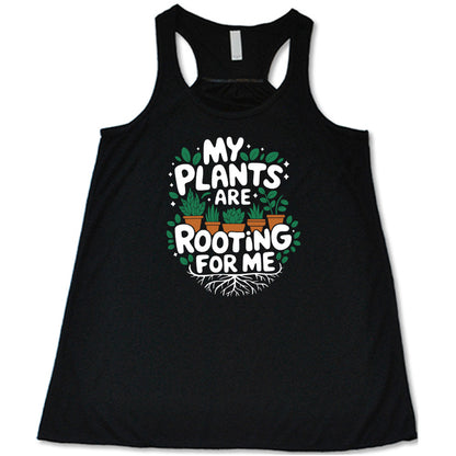 Black colored flowy tank with a potted plants and roots graphic on it that says "My Plants Are Rooting For Me"