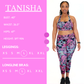 Graphic showing the measurements of a model and what size she wears for the dress. Her bust is 43 inches, waist is 41 inches, hips are 48 inches, and height is 5 foot and 9.5 inches. She wears a large in our leggings and sports bras
