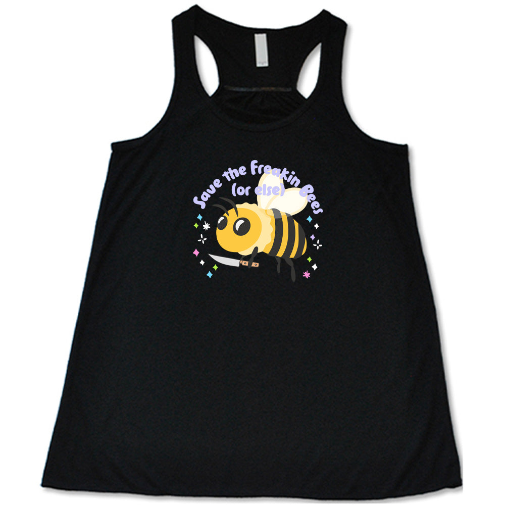 Black colored flowy tank with a bee holding a knife graphic on it that says "Save The Freakin Bees (Or Else)"