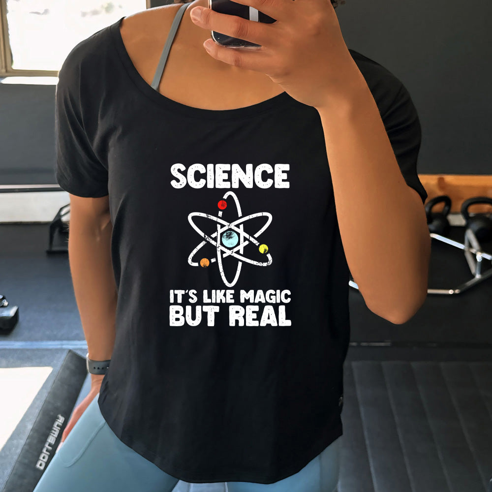 This new Science It's Like Magic But Real Slouchy Tee redefines casual comfort! Its off-the-shoulder design and super-soft fabric make it the ultimate relaxed fit. Lookin' good never felt so good!