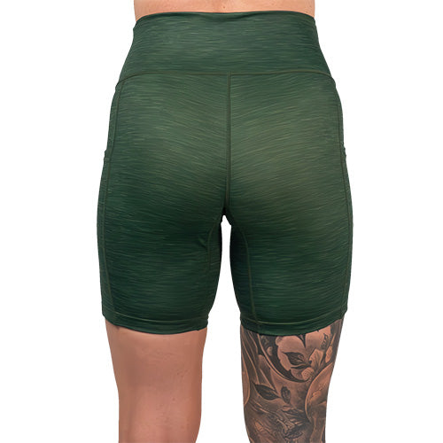 Shop our Heather Green workout shorts. High-quality, fun gym shorts for all types of fitness that stay in place no matter what you're doing.