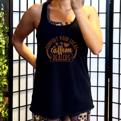 Shop our Support Your Local Caffeine Dealers Tank Top.  Affordable, fitness gym clothes for all types of fitness.  For anyone who goes hard in the gym.