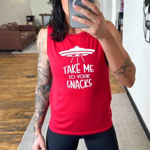 red muscle tank top with a white quote on it that says "take me to your snacks" with a ufo on top of it